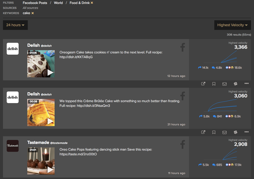 Using step 1 above, you’ll have identified different topics worth monitoring. You can use NewsWhip Spike to see which social platforms have the most active audiences for those topics. Spike lets you compare and analyse stories on six platforms: Facebook, Twitter, Instagram, Pinterest, Youtube, and LinkedIn. As a comparison, let’s use the baking example again. Here’s what a 24-hour search for “cake” yields in Instagram, versus the same search in Facebook.
