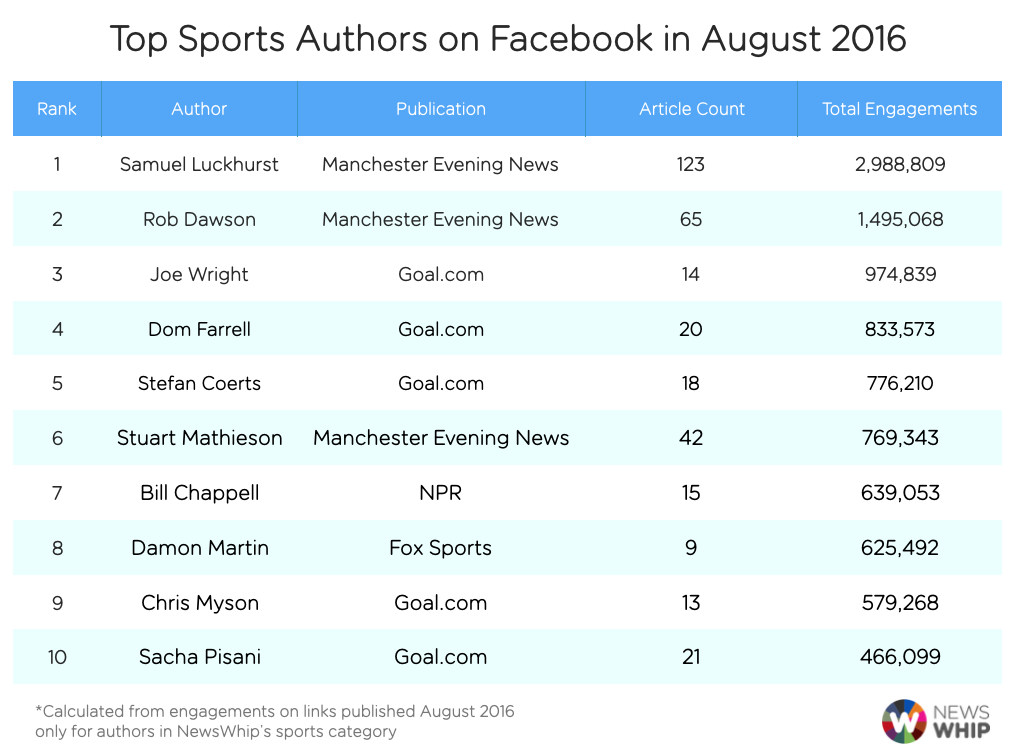 This time, we’ve broadened our scope to the entire sports category in NewsWhip Spike. Which authors saw the biggest wins on Facebook for August?