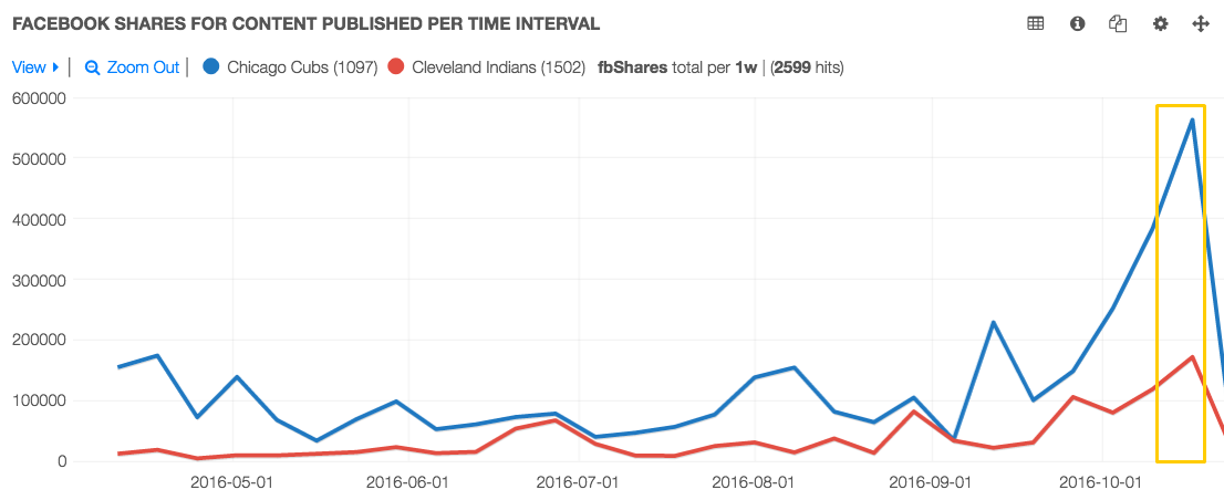 This graph, from NewsWhip Analytics, shows just how wildly Facebook’s sports fans reacted when both teams made it into the World Series (labelled in yellow).