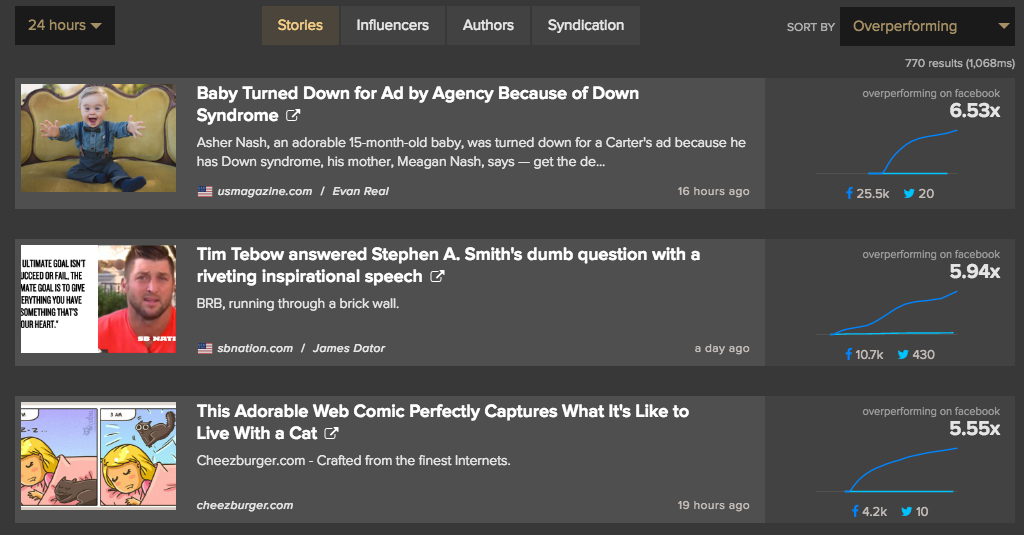 Take a look at this curated Spike panel, sorted by Over-performing stories across Facebook and Twitter. The panel is focused on US publishers in the past three hours.