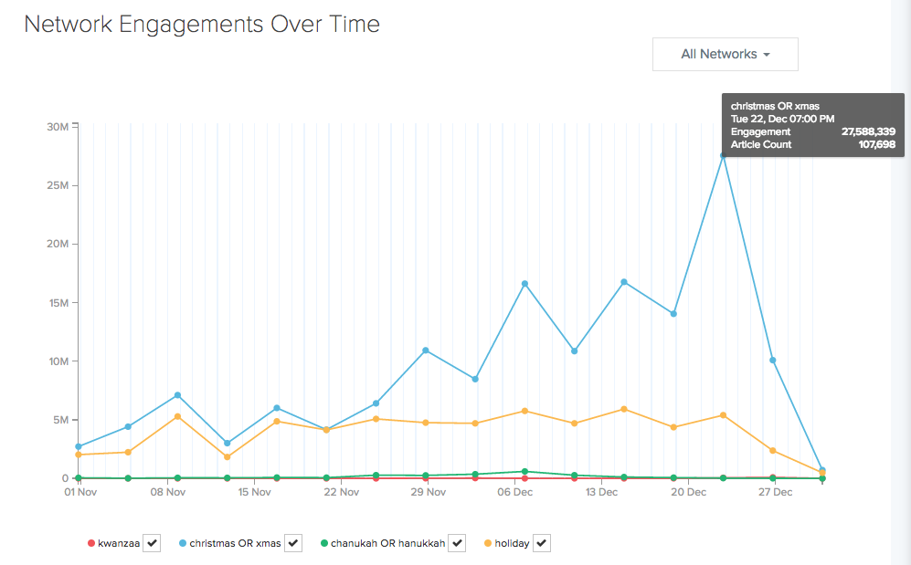 Content with Christmas or Xmas keywords saw enormous engagement compared to other December holidays. While activity did begin in November, there was a steady increase in engagement post-Thanksgiving. The biggest peak occurred on December 22nd, just enough time for some last minute presents or recipe planning.