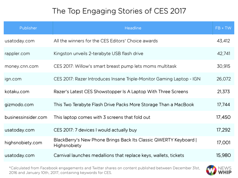 Rappler is the only unknown in the top ten here, a self-identified “social news network where stories inspire community engagement and digitally fuelled actions for social change”. Rappler’s CES coverage nonetheless drove interest among their followers, with this story driving over 43,000 engagements on Facebook and Twitter.