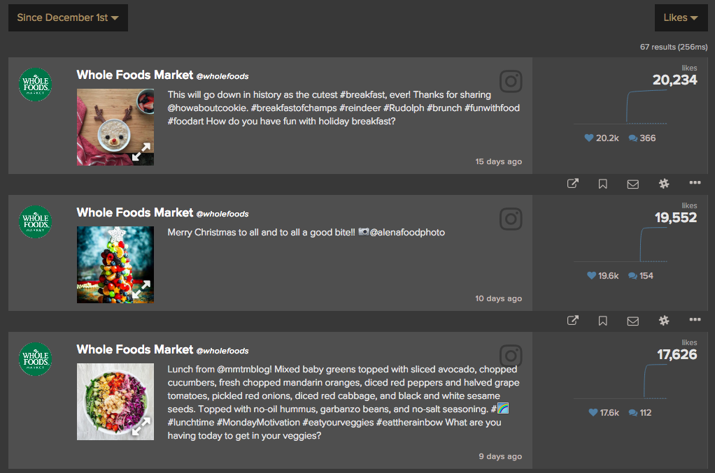 Looking at Whole Foods’ Instagram, we can see that the top content in December came from holiday food posts. But beyond that, we can also note that these three top posts came from re-gramming photos from other Instagram users. These are tactics they may want to continue.