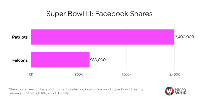 Content around the New England Patriots on Facebook drove nearly triple the amount of shares that content around the Atlanta Falcons did.