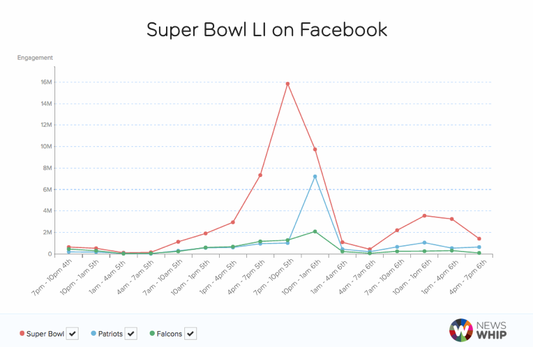 Around 8:30 p.m. EST, mentions of the Patriots started to sharply spike as the Patriots started to score, leading to the most dramatic comeback in a Super Bowl. Engagements around the Falcons, which had been close to the Patriots during the game, dipped as the Patriots gained momentum.