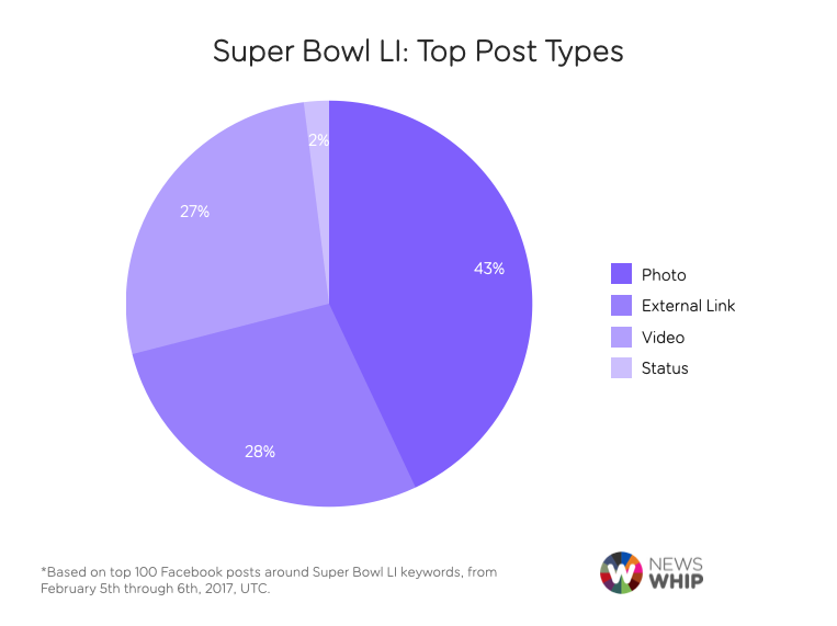 Visual content, videos and photos, still combined to make up the majority here, but external links show that Facebook users were engaging with publishers’ domain content that was being posted to the platform. The top link posts led to analyses of the game and controversial commercials, recaps, and what celebrities and politicians at the game were up to.