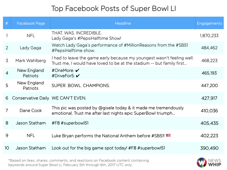 Four of the top ten posts came from NFL and the New England Patriots, as to be expected. Also unsurprising is the post from Lady Gaga, as she performed the halftime show. Celebrities accounted for four of the posts — Jason Statham was promoting his Super Bowl commercial appearance, while Dane Cook shared his reaction to the win and Mark Wahlberg shared why he left the game early.