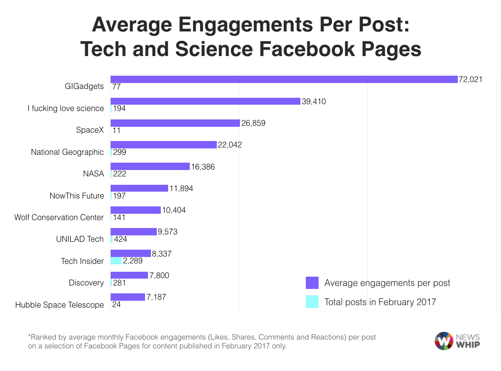 That in mind, we looked at several Facebook Pages in our science and technology category that were driving high average engagements per post in February.