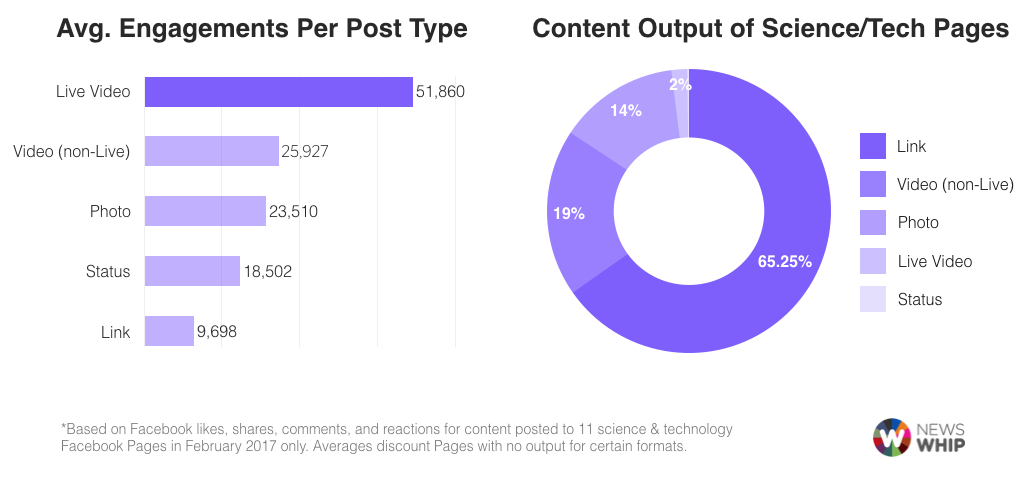 Facebook Live was the most engaging format in terms of engagements per post. It makes sense — users want to be in the moment of these Pages’ content, whether it’s a scientific discovery, a journey to outer space, new tech demonstrations, or getting up close and personal with some exotic wildlife.