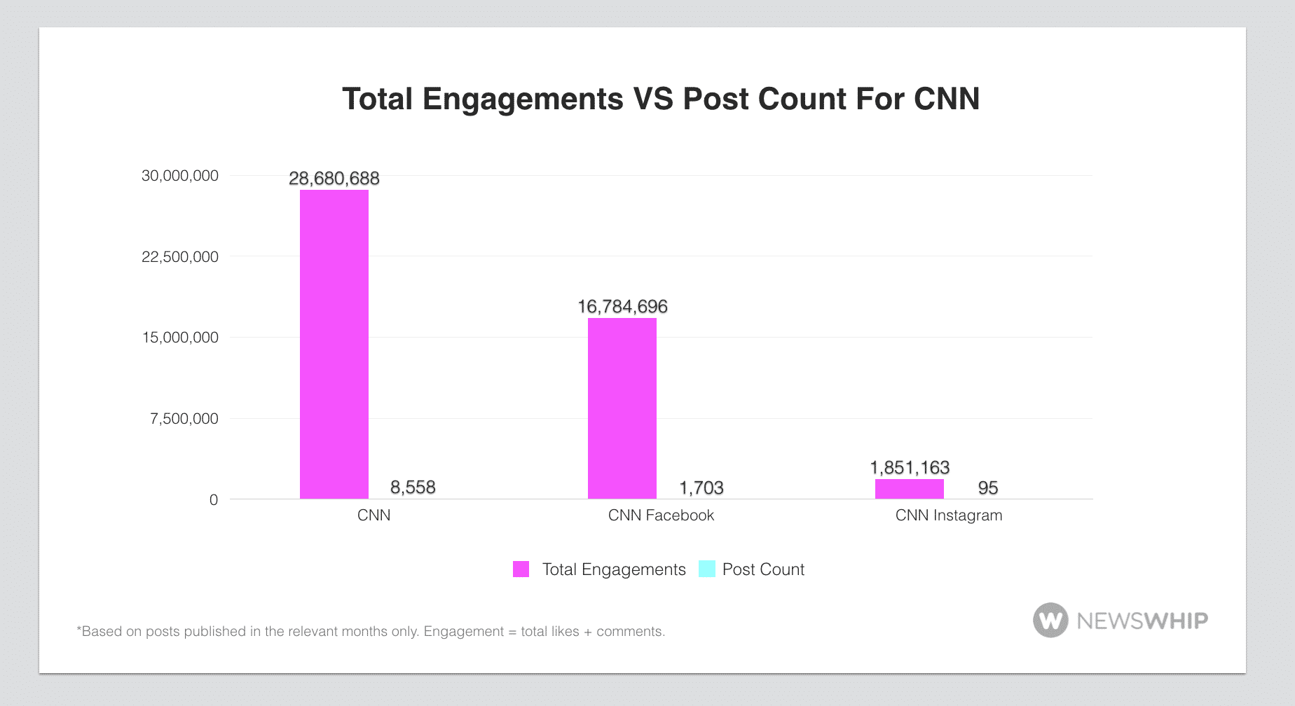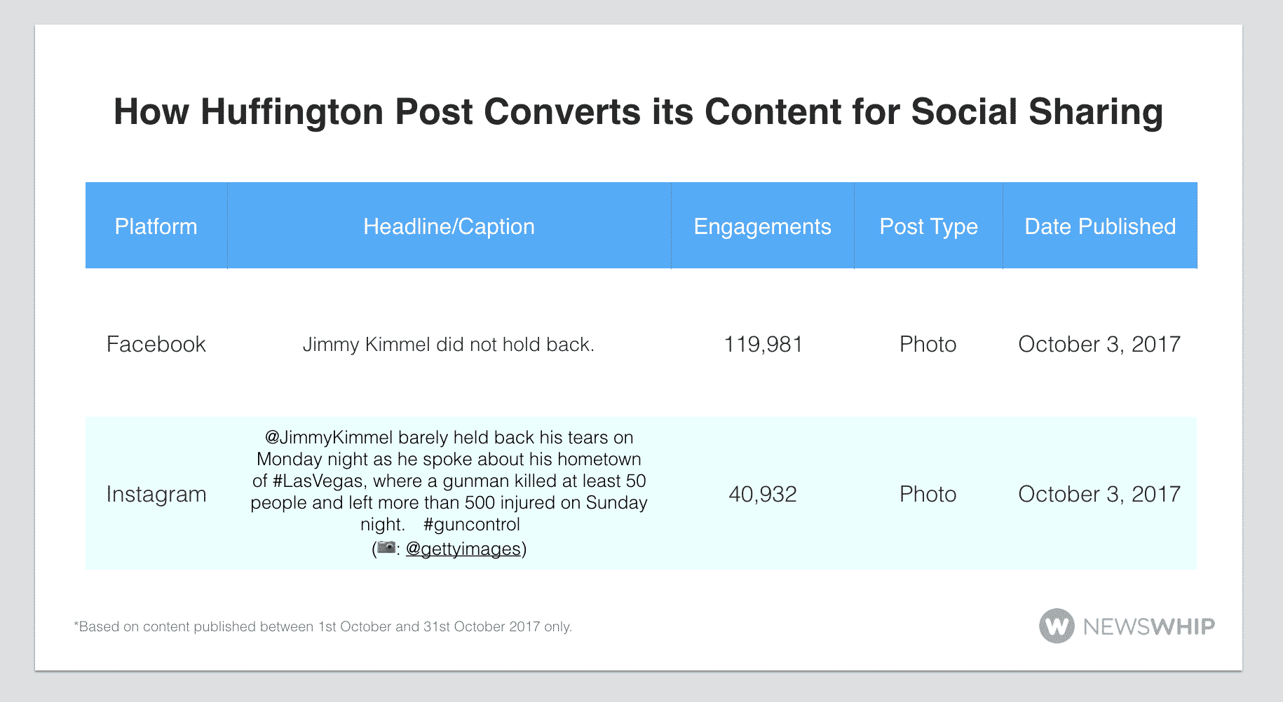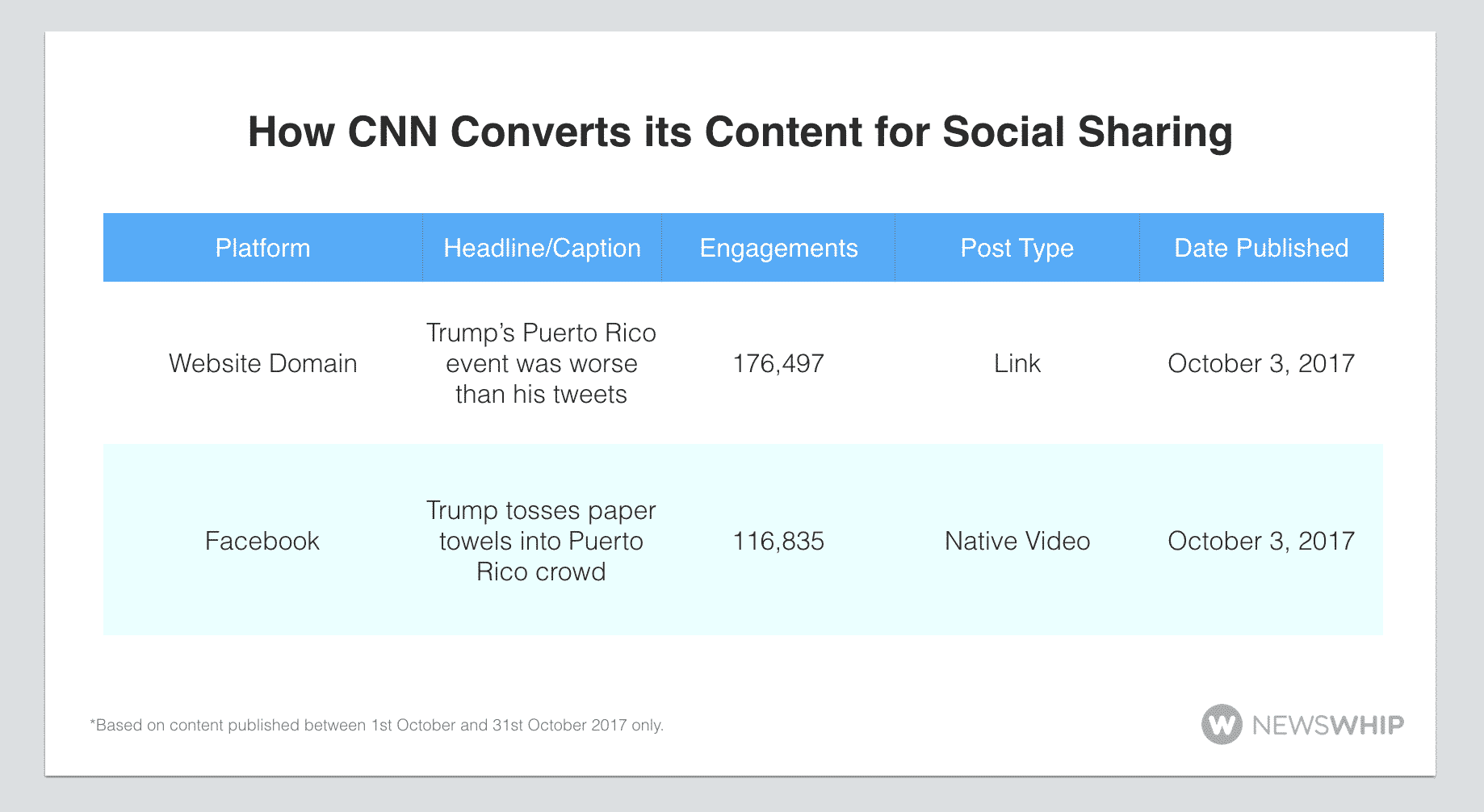 For October, the most popular post type on CNN’s Facebook was video, accounting for 59 percent of total engagements, and the most common reaction for the month was “Sads” with nearly 28 percent of all engagements, due to content in relation to Puerto Rico, gun violence, President Trump, and the Las Vegas mass shooting. On CNN’s Instagram, the most popular post type was photos, with 53 percent of total engagements, which shows us how CNN mixes up its post types for audience success.