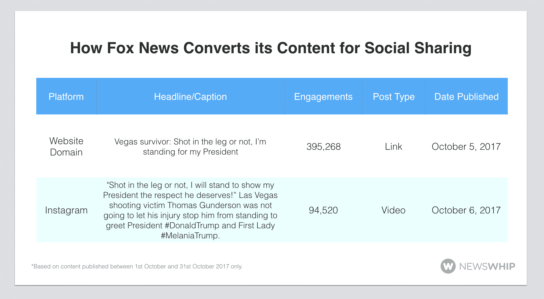When posted to Instagram, the publisher turned the post into a video, making it shareable and compressing its content, which resulted in an additional 100,000 engagements and the number two slot of top overall content of all publishers we analyzed on Instagram. A content strategy here that we see Fox News employing is evaluating what content might need a social boost and then reposting that less popular article on another platform to strengthen engagement.