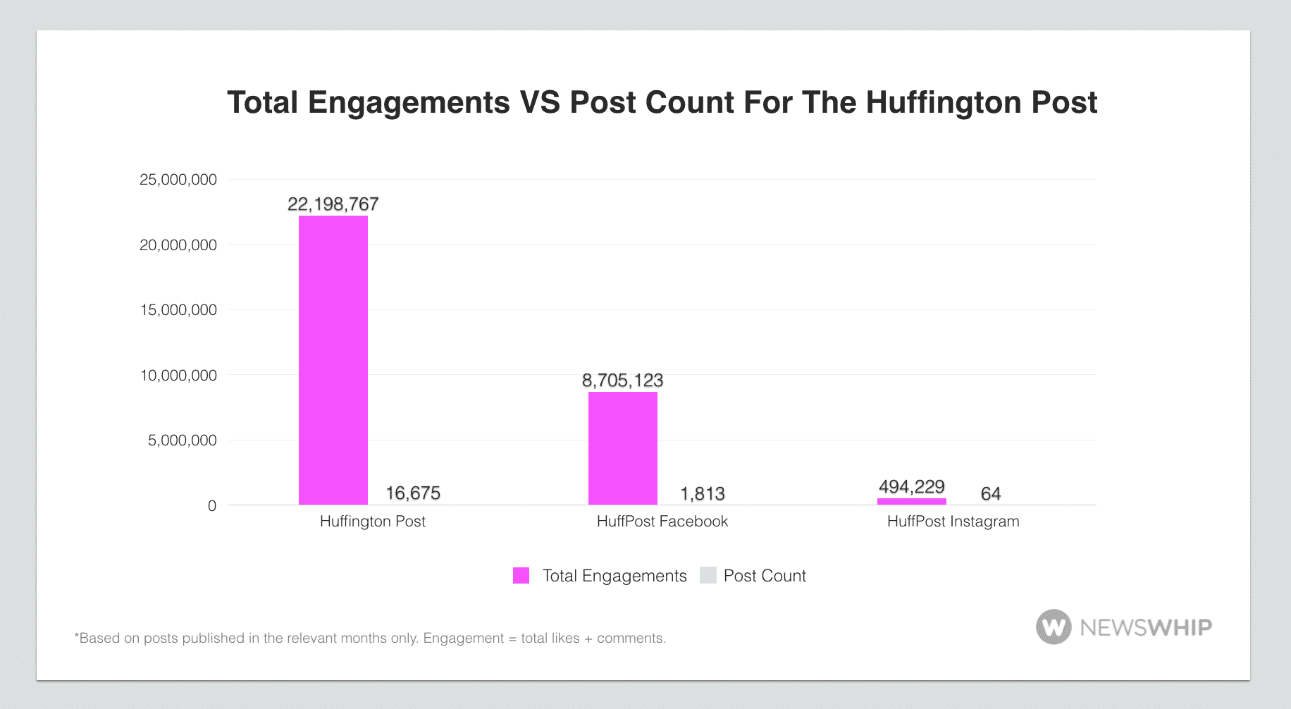 The Huffington Post has a lot of overlap on their website and their Facebook, as their strategy revolves around simply reposting links rather than taking the time to re-design and re-articulate their content for different platforms, as is evident in links being the most engaged with post type.