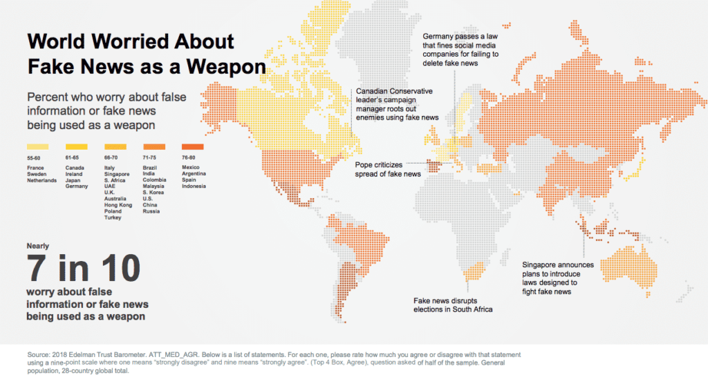 “For the first time ever there is now a distinct split between extreme trust gainers and losers,” the report outlines. The U.S. saw almost 9 percent drop in trust in the ‘institutions of government, business, media and NGOs’ over 2017, while 63 percent of respondents globally claimed that they were unable to tell good journalism from rumour or falsehoods.