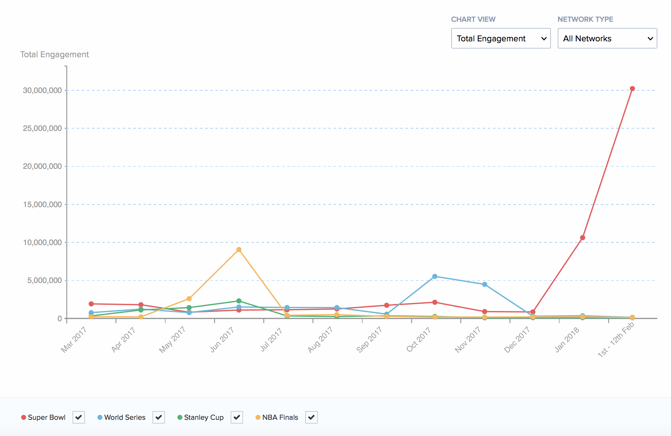 Our data shows that the Super Bowl generates far more engagements on social than any of the other major North American sporting events, with the 30 million engagements it drives at its peak more than 3x that of its nearest rival, the NBA finals.
