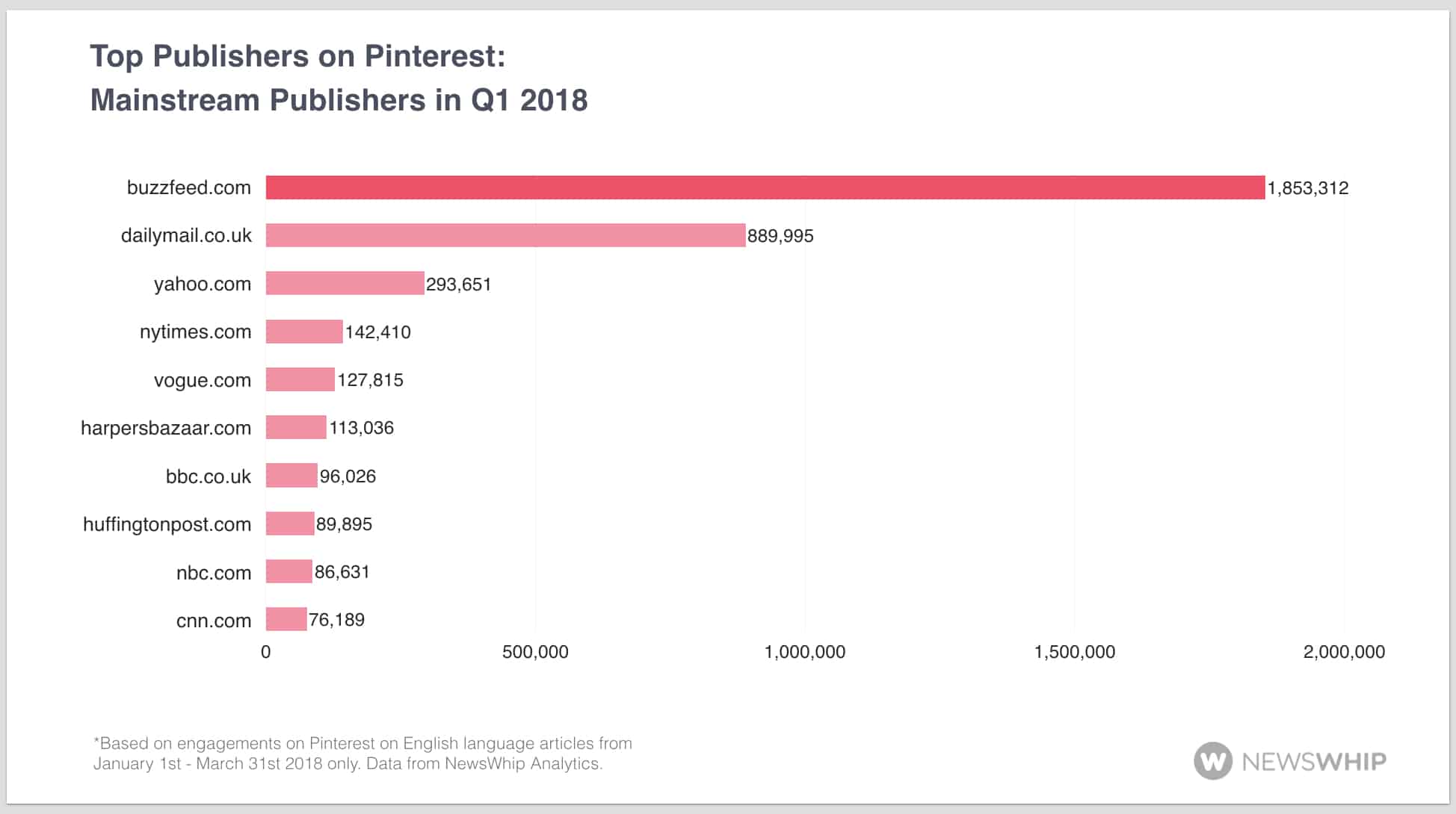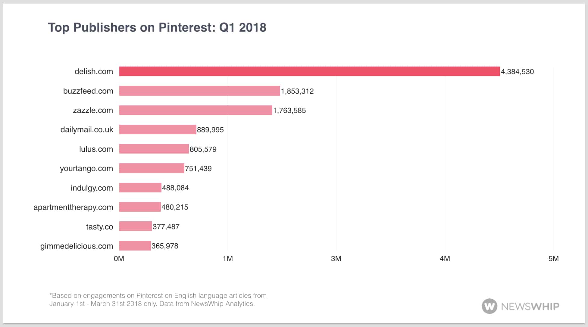 Last year the most engaged publisher for Q1 on Pinterest was BuzzFeed, with over 3 million engagements on its content. There are then two other clear winners with over a million engagements with delish.com and cookingclassy.com both appearing in the top three.