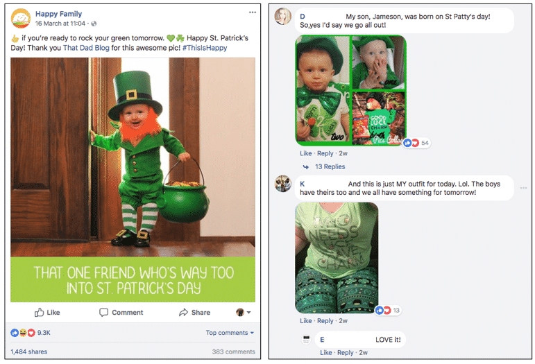 We see this with Happy Family, a baby food brand. On Facebook, the brand will often share photos of the holidays, and encourage users to share photos of their own revelries: