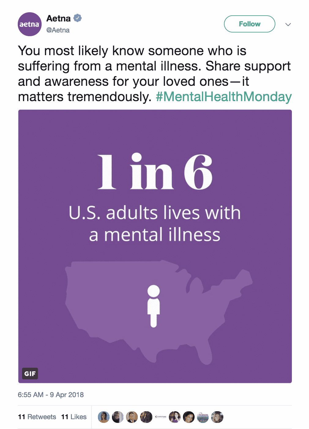 Chris Rackcliffe said, “At Aetna, for Mental Health Monday, we decided to lay a stake in the ground on Twitter, and encourage people to reach out to each other around mental health.”
