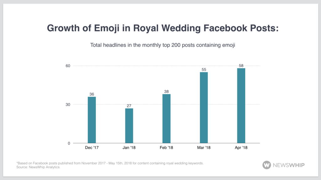 That in mind, we took a look at the top Facebook posts, month-by-month, around Prince Harry and Meghan Markle, to see if there was an uptick in emoji in the captions.
