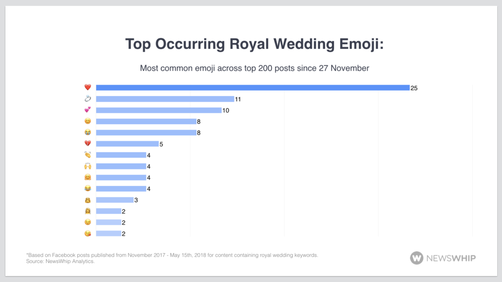 Interestingly enough, the hypothesis was correct. As we’ve approached the wedding and buzz has continued to build, the top posts have had more emoji. So which emoji were used in the most engaging posts?