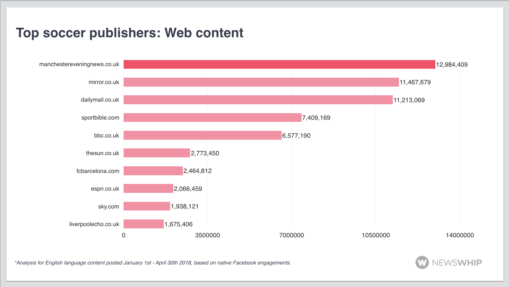 We also narrowed this down to look at publishers specifically, leaving out club content. Facebook engagement to content from publishers’ Facebook Pages was much more video focused than we saw with the more general content. Many of the same publishers appear as we saw appear in the web rankings previously, with UK publishers tending to dominate.