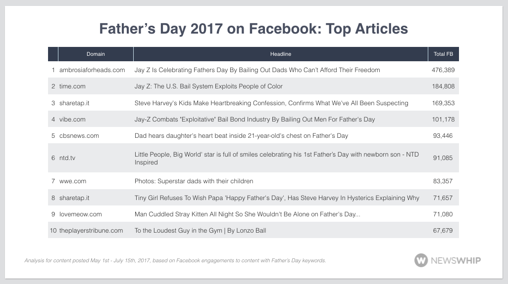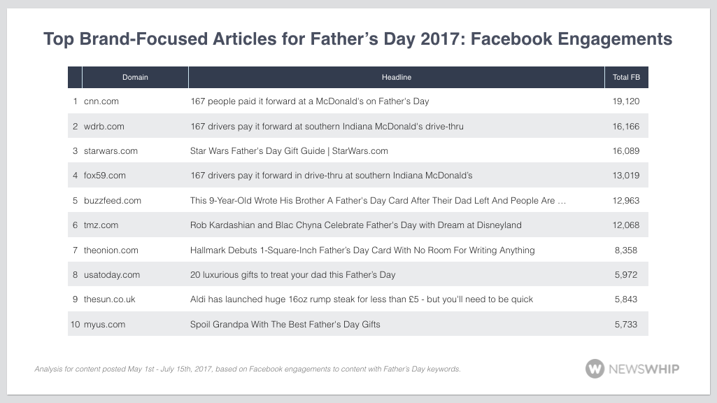 For web content, Facebook drove the majority of social engagements, when compared with Twitter, Pinterest, and LinkedIn. The top publishers for Father’s Day 2017 tended to be niche and pop culture publishers, along with general news sites. Celebrities and positive news featured in the top stories, though beyond that we also saw stories about crime on the holiday driving engagements.