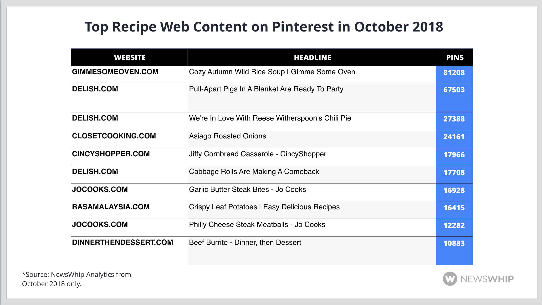 Of the top 1,000 articles on Pinterest for October, 587 were recipe blogs, from everyone from the tiny blogs to huge publishers in the space such as Delish and BuzzFeed. And while one of those things is not like the other, it was not a given that a recipe pushed by Delish would garner more pins than one by a small blogger. Pinterest users aren’t here to pre-judge, apparently.