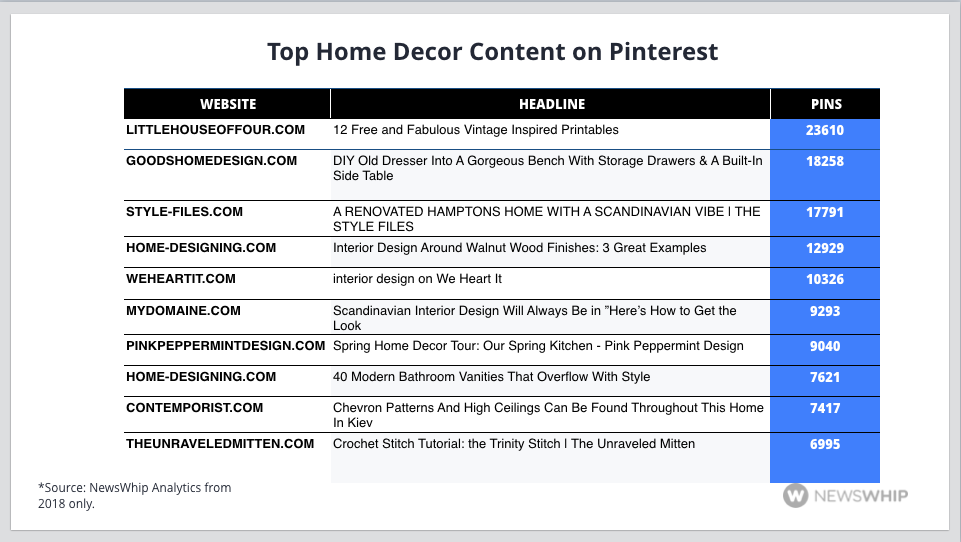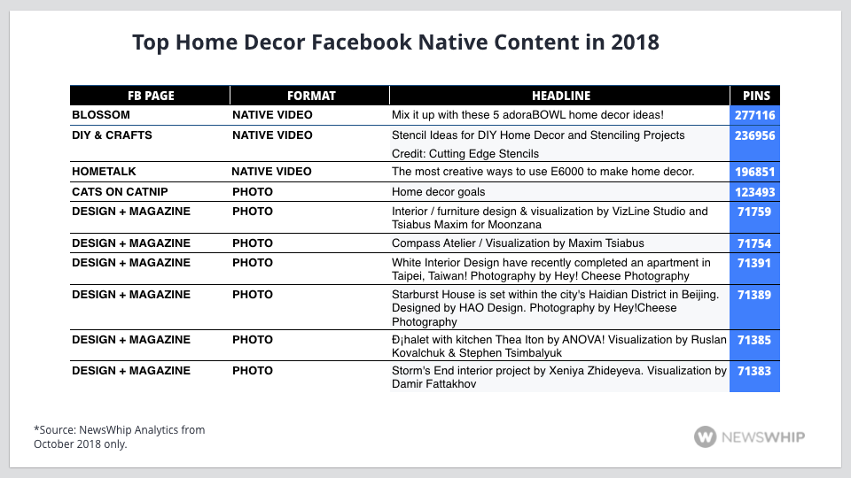 As mentioned, interior design and home decor content was a little less impressive on the web, and we focused just on Pinterest when we looked because web content does not tend to garner a huge amount of engagements on Facebook relative to its native counterpart.