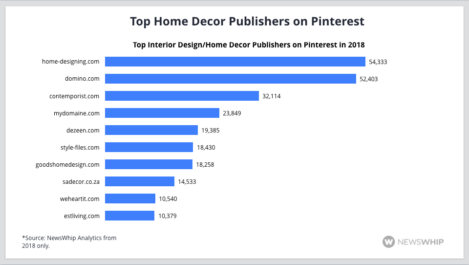 The top publisher of home decor content in terms of the Pins its web content attracted was home-designing.com which garnered around 54,000 engagements, with the second place going to domino.com at 52,403. Beyond that the number of engagements fell off rather dramatically, with the bottom of the top ten only garnering around a fifth of what the top publishers in the space did in terms of Pins.