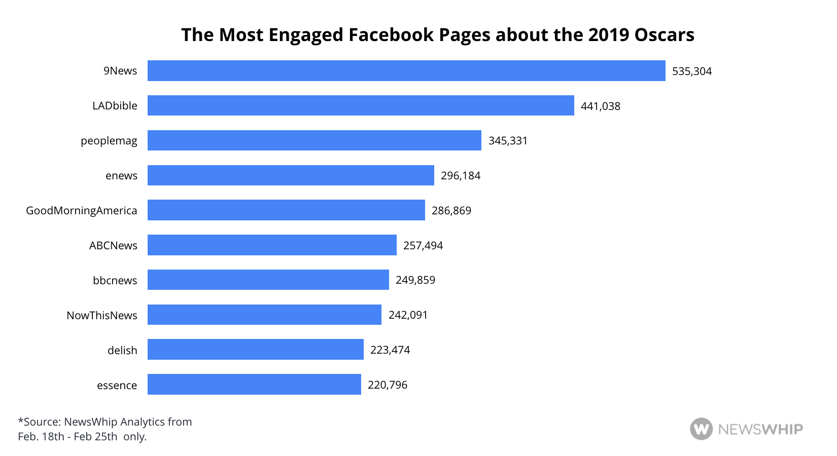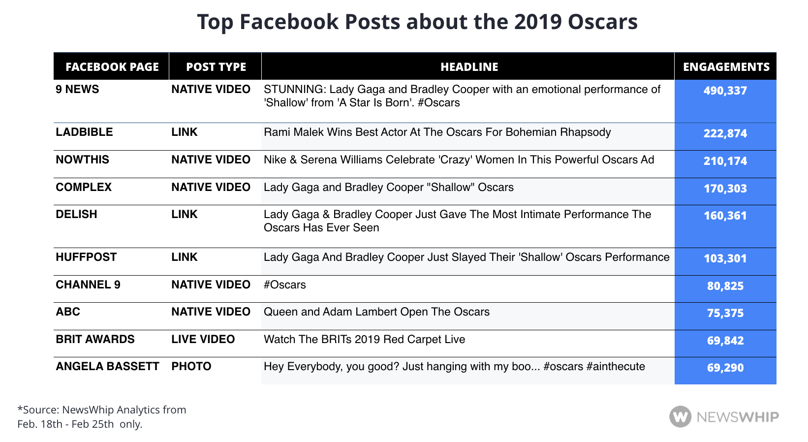 The top Facebook Posts of the Oscars were in some ways a continuation of what we saw on the web. Lad Bible’s link to their Rami Malek best actor story received 220,000 engagements on their page, meaning about half their engagements were driven by their own promotion of the story, and about half came from others. Three of the top ten posts were link posts, while the rest were mostly video.