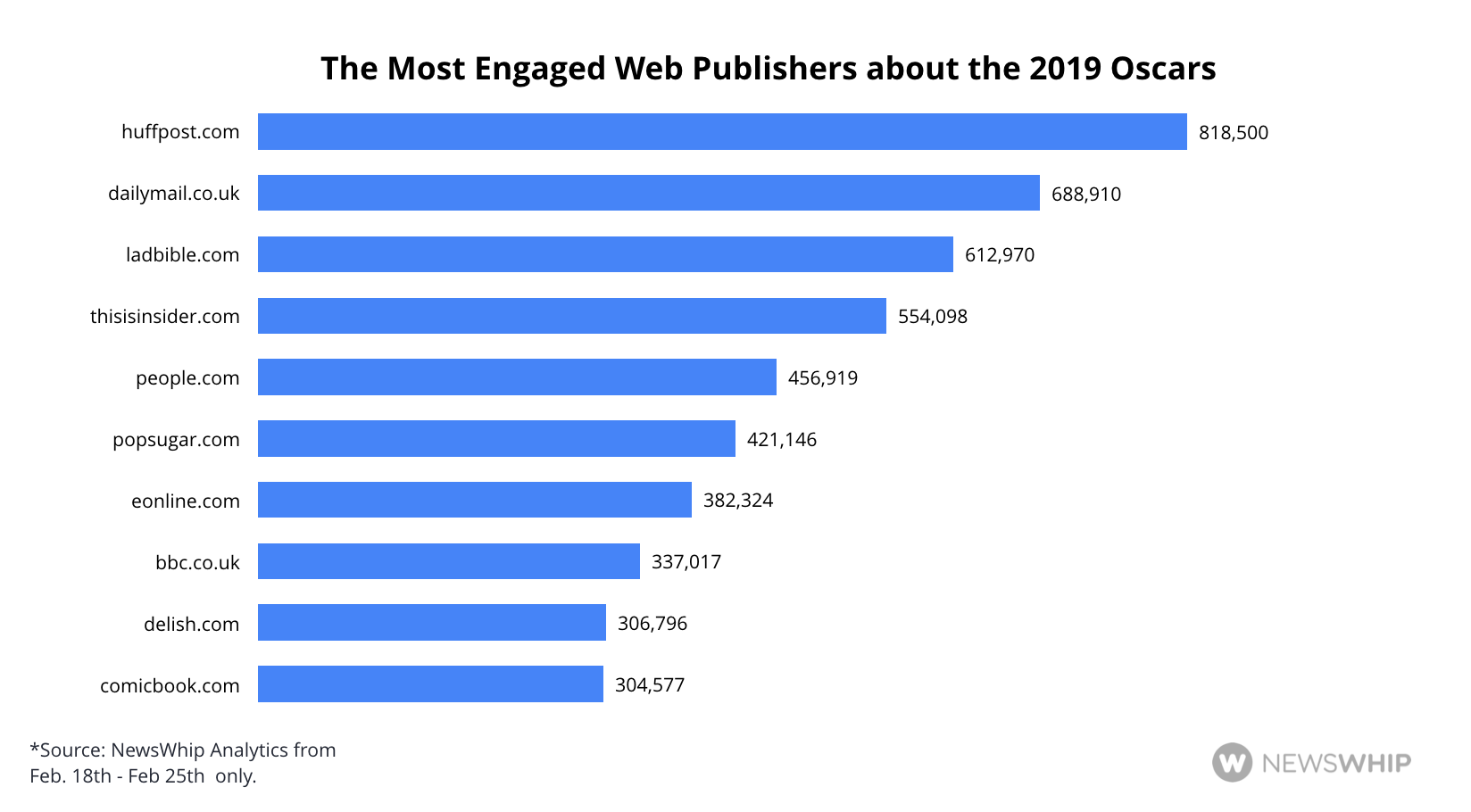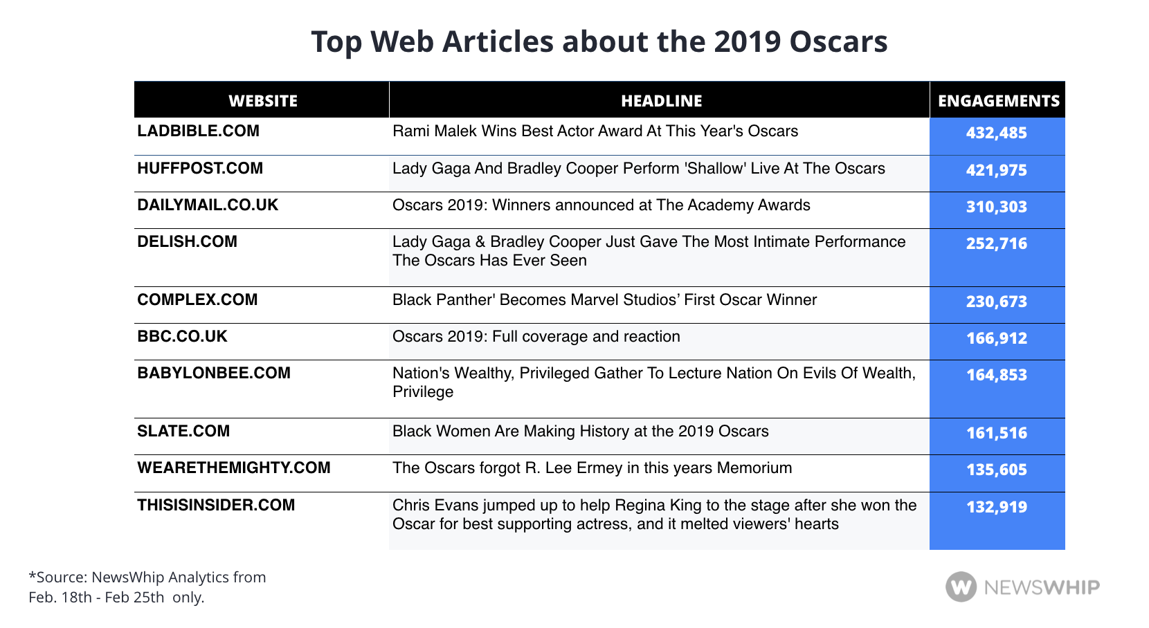 The top web stories were mostly about the winners, with Rami Malek leading the pack. Lad Bible’s story about him winning the Best Actor category for his portrayal of Queen frontman Freddie Mercury in Bohemian Rhapsody was the most engaged story of any at the Oscars, garnering almost half a million engagements.