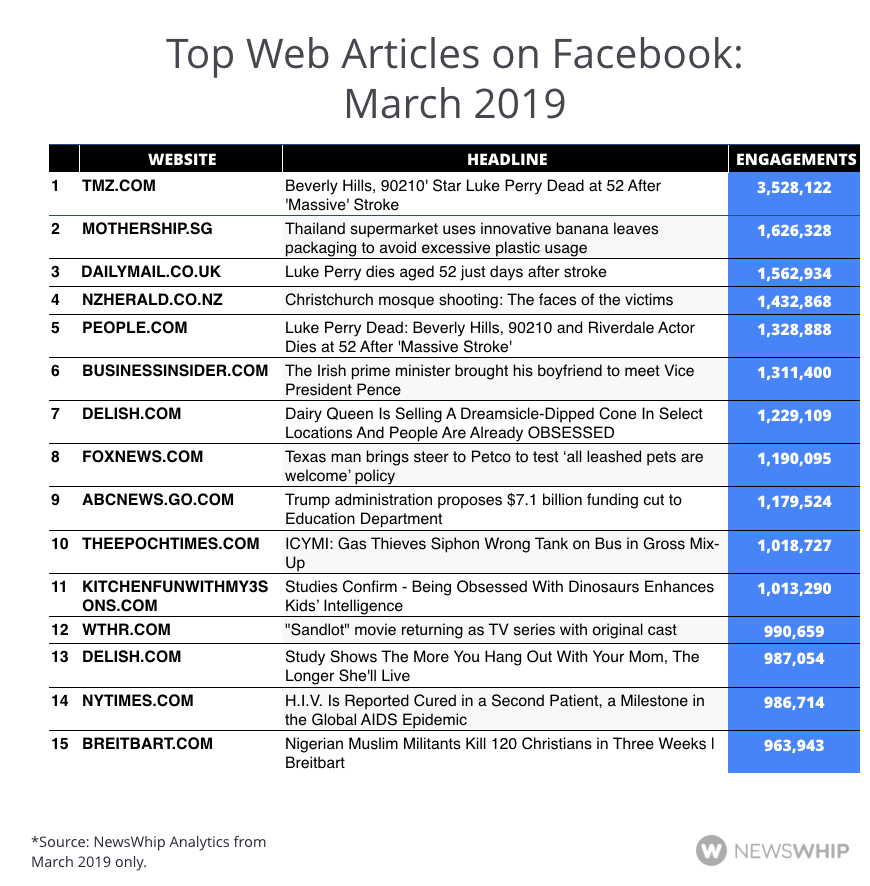 Unlike what we saw in February, there were some very clear top stories in March: the death of actor Luke Perry after a stroke, at the age of 52 and the Christchurch shooting, coverage of which and of its aftermath dominated headlines for many publishers.