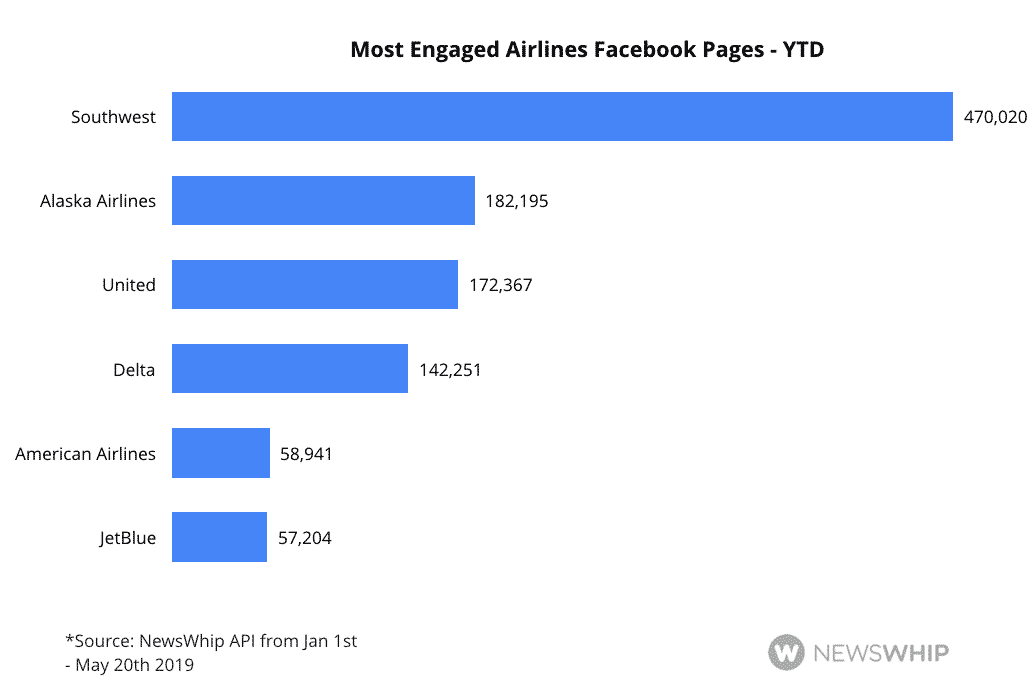 Looking at the owned Pages across these airlines, it’s clear that Southwest gets all the love, evidenced by their 6 million page likes, high average engagement, and largest total engagement sum at almost half a million. Their performance with respect to these top-line metrics has positioned them to eclipse the competition, despite the brand being targeted as a key airline during the 737 MAX 8 crisis.