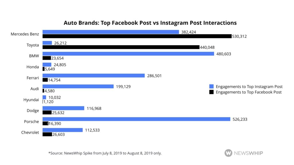 Porsche is consistently garnering high engagement on Instagram, getting over 500k likes and comments isn’t out of the ordinary for them, but when it comes to Facebook, no one is really engaging with them there. The last time we took a look at auto brands on both Facebook and Instagram, Instagram was far outperforming Facebook on every single brand page. With changes to algorithms and new features on Instagram, it’s been interesting to watch brand strategies change.