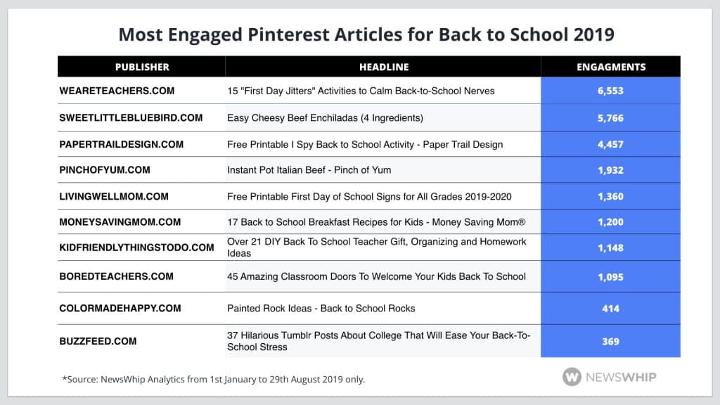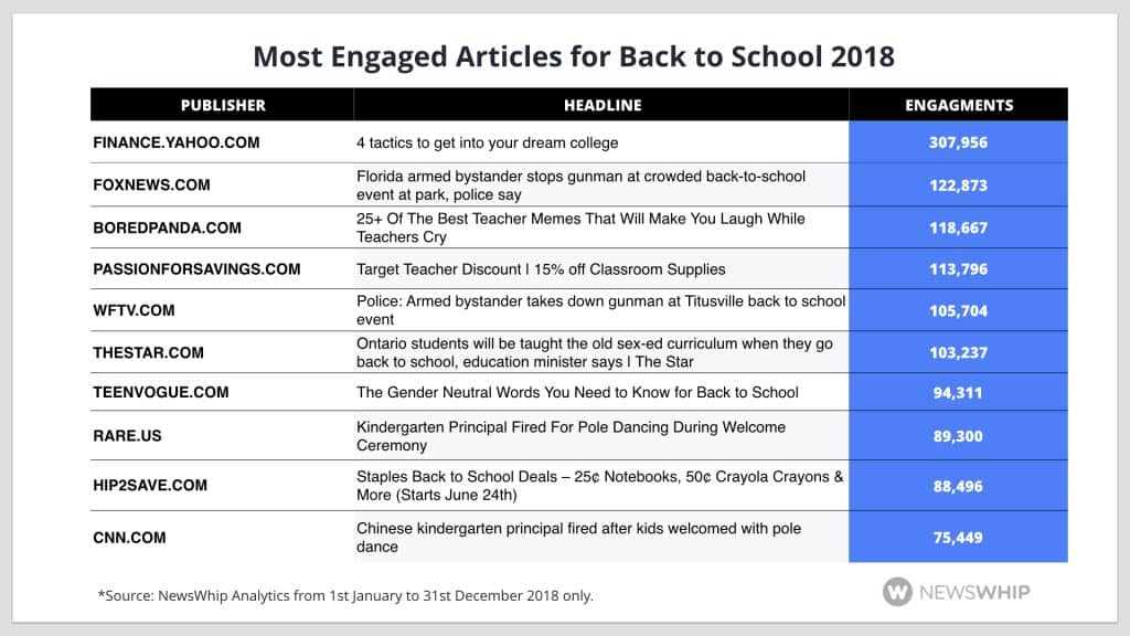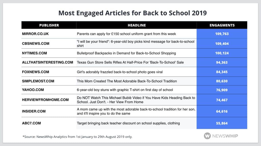 2019 had particularly high engagement due to a high volume of stories reporting on the El Paso Shooting, where customers shopping for back to school supplies were fired upon as they browsed the aisles. The most engaged article came from sfgate.com, generating over 650k interactions on their coverage alone. In order to accurately show which stories were focused solely on back to school shopping itself, we’ll round up the usual top ten most engaged stories across social while emitting explicit coverage of the shooting, though we wanted to mention it for completeness.