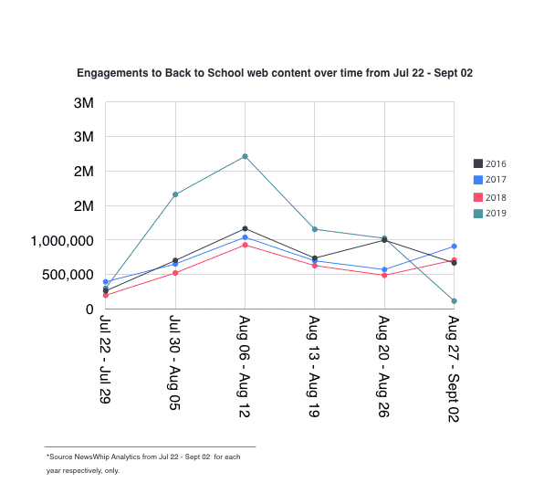 With the exception of 2019, engagements to back to school content have fallen a bit each year since 2016, though they’ve followed very similar patterns as far as spikes in coverage, reflecting the weeks outlined above. If you feel like back to school content starts earlier and earlier each year, you’d be right. But it’s not as drastic as it seems. In the past four years, promotions, and coverage thereof, picks up around the end of July, but this year, engagement spiked at 800k in June and flew into the millions come August.