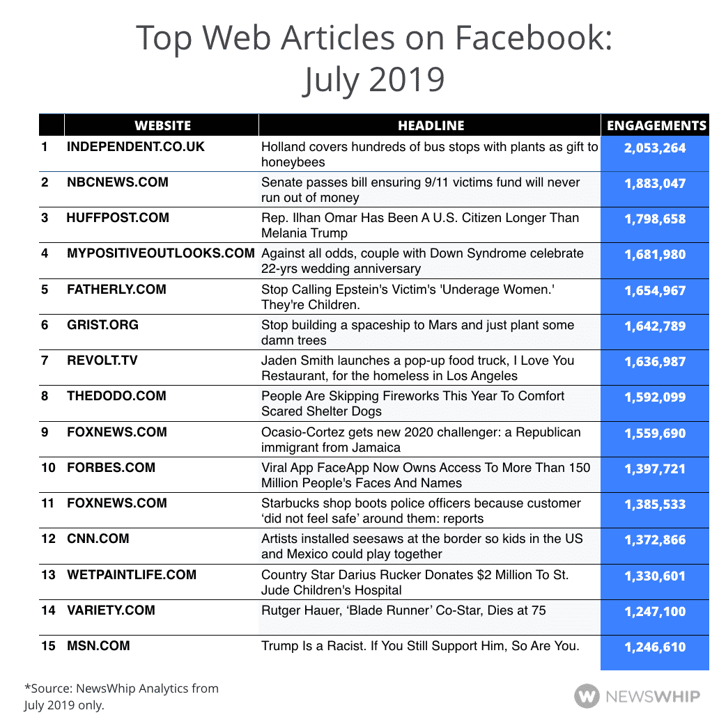 CNN’s success was driven by a variety of stories. The top article for the publisher was about see-saws being installed by artists at the U.S.-Mexico border so that children could play together. This article received some 1.4 million engagements, but CNN also had an article about the USWNT winning the football world cup in July that received more than a million engagements, and the top ten really did contain multitudes. Stories featured everything from articles commemorating the official end of segregation, to the birthday of the USA’s oldest woman, to cockroaches becoming immune to insecticides.