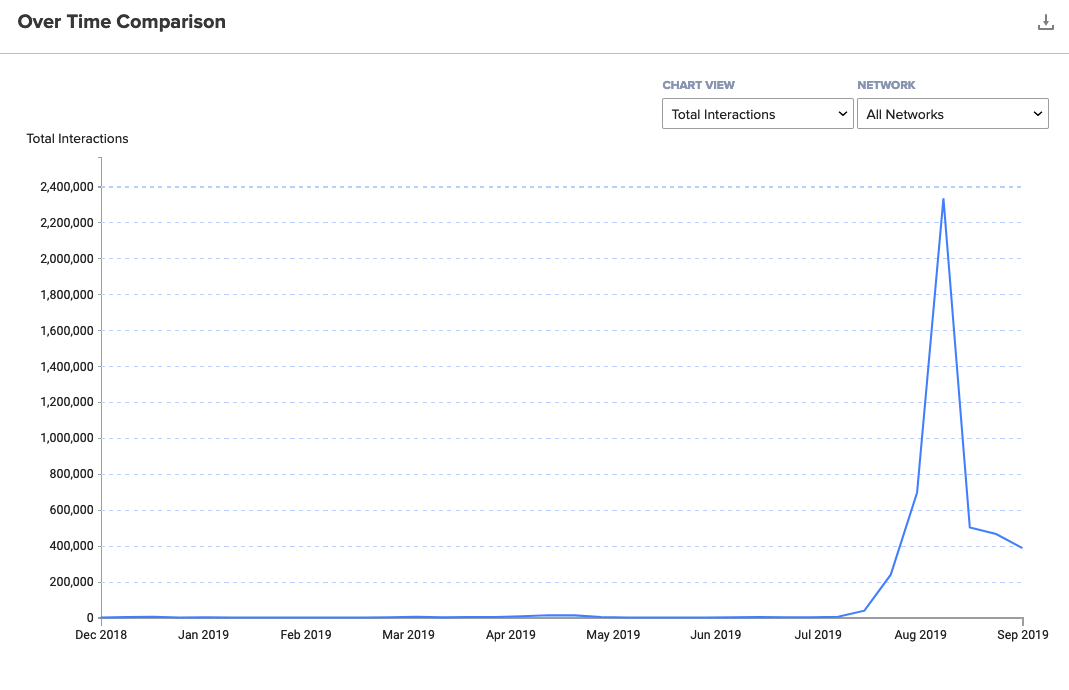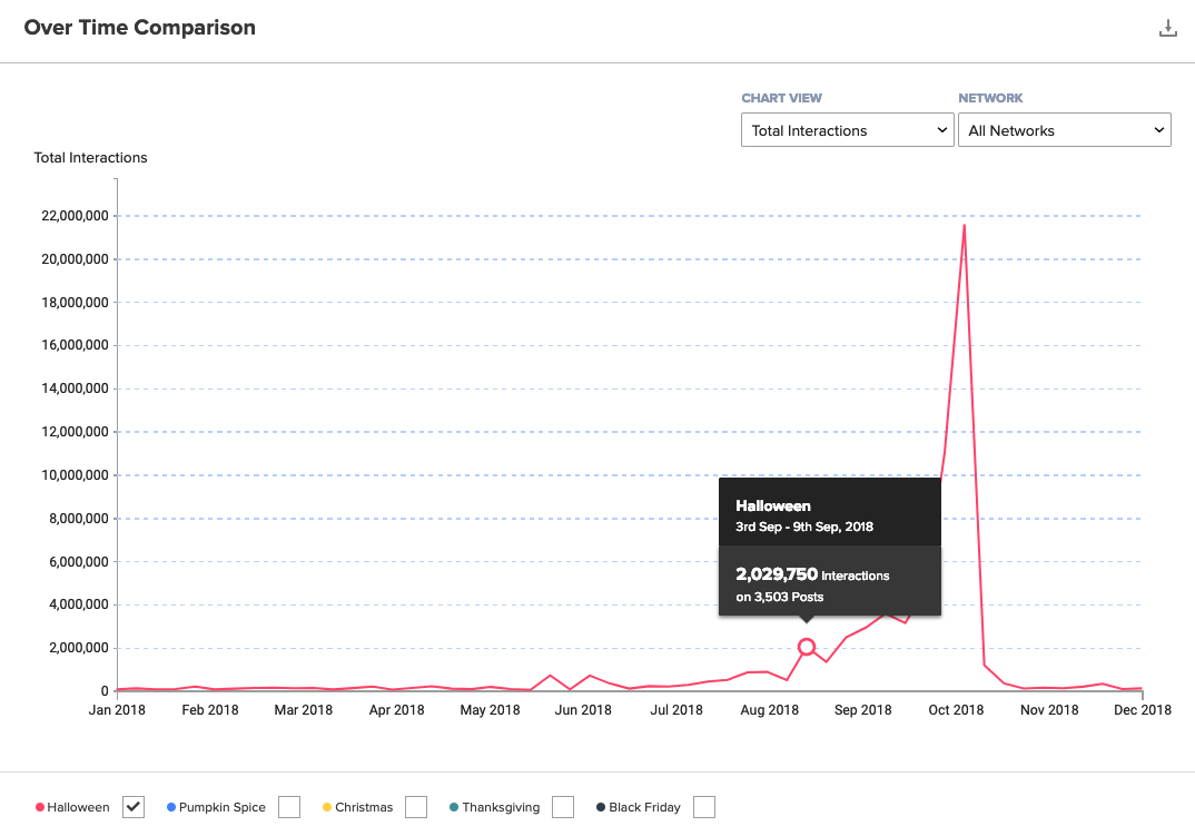 Many brands are pulled into the conversation regarding new products and Starbucks may as well be synonymous with the season thanks to their original Pumpkin Spice Latte that started it all. Last year, pumpkin spice peaked in August at only 490k engagements, but this year hit over 2 million. So poke fun all you want, but brands and publishers are enjoying the fruits of their labor as pumpkin spice continues to climb in engagements and acceptance year over year. And if you hate it, rest assured, pumpkin spice falls out of the news cycle by mid-October, though people are already weeks deep in Halloween discussions at that time.