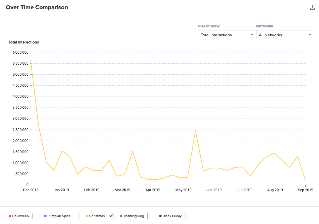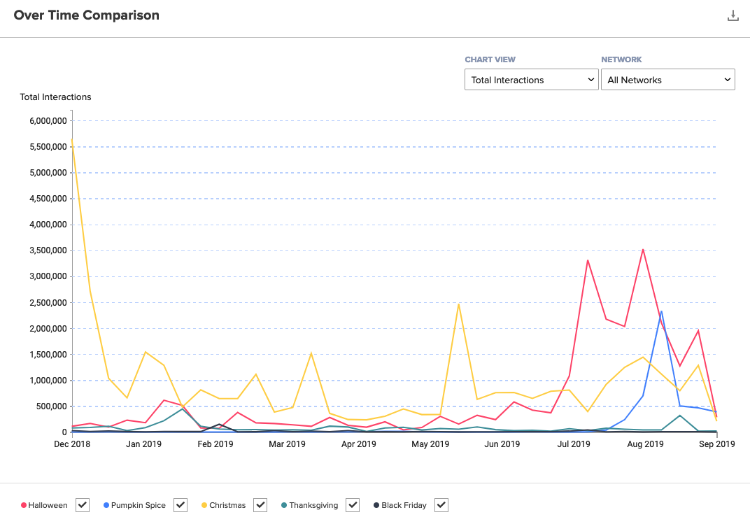 Per last year, we should start to see content focused on Thanksgiving toward the end of September and gearing up for larger campaigns during October. 2017’s thankful season saw 13 million engagements for the holiday, while 2018 blew past 22 million on Thanksgiving day, and we’ll probably see an even bigger jump this year. Black Friday takes the smallest piece of the pie considering the holidays we are focusing on, but still gets a respectable 800k interactions by mid-October, peaking at 6 million last year during the sale itself.