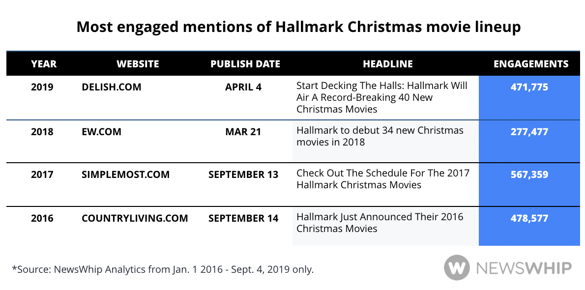 These stories typically generate hundreds of thousands of engagements and are always published during the Christmas “off-season” or in 2019’s case, before Easter even happened. 2018’s iteration of this story was published in March, though engagements were slightly lower, illustrating timing still matters when it comes to promoting something like Hallmark movies too early.