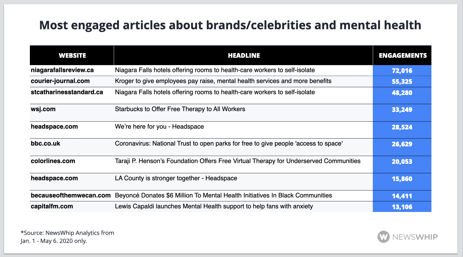 Chart showing the top articles about mental health initiatives in 2020, ranked by engagement