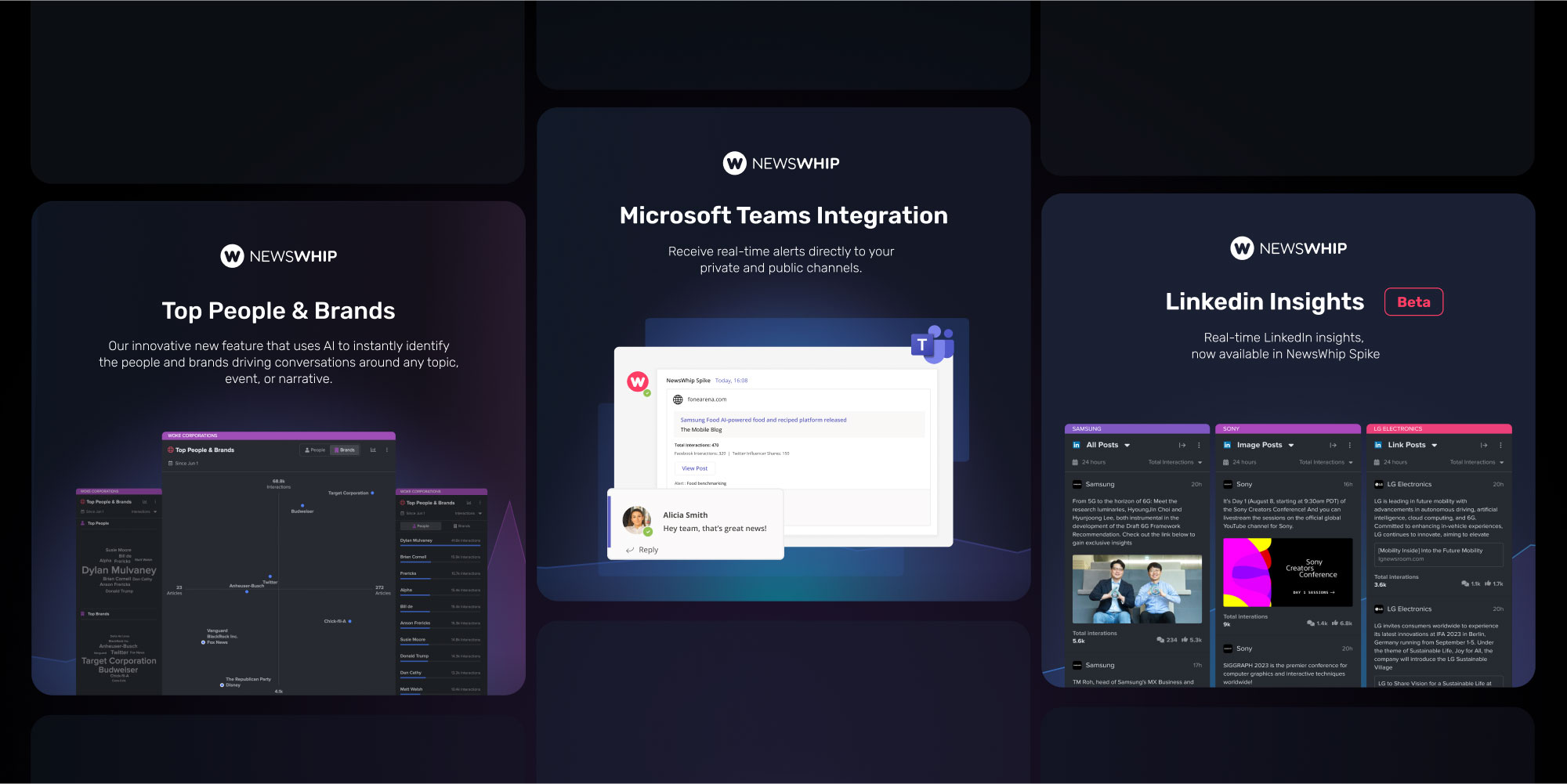 And for the real-time, automated distribution of alerts and insights, we have added MS Teams alerts to our existing Slack and email offerings. This integration with MS Teams embeds NewsWhip better into our clients workflow and allows team-wide access to updates.  Â