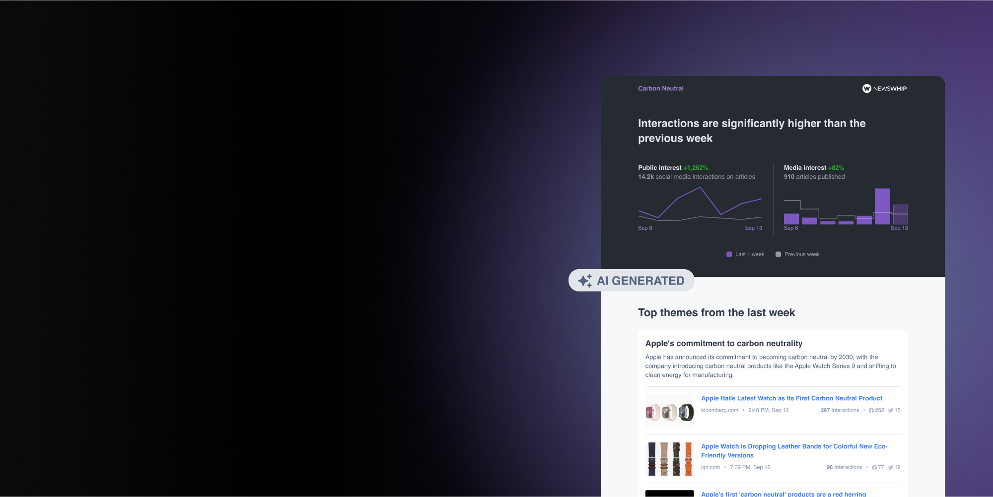 - NewsWhip identifies the most engaging stories on that topic. It gathers data around it and uses Large Language Models to analyze, extract key themes, and cluster them by topic.