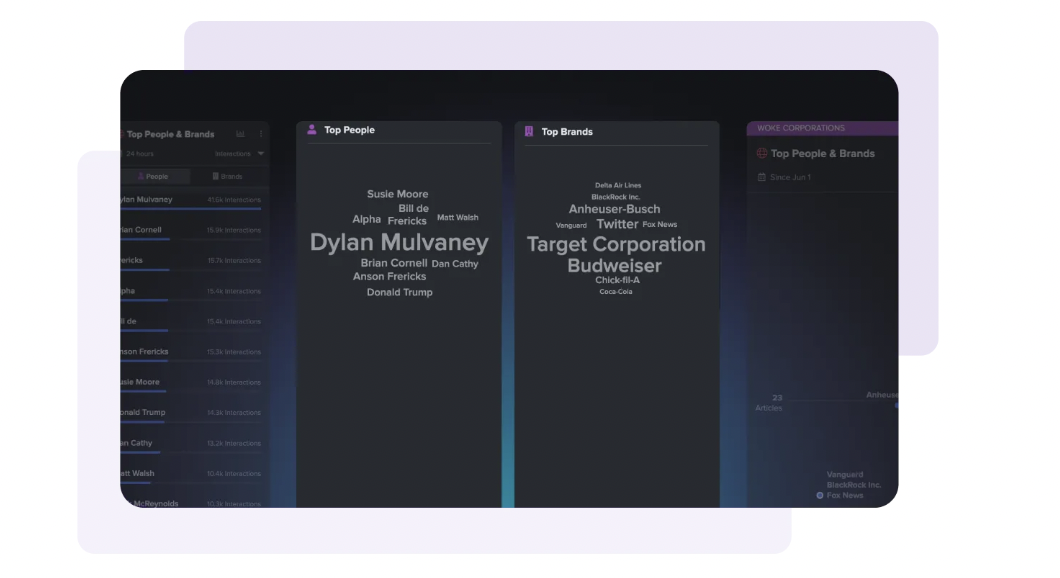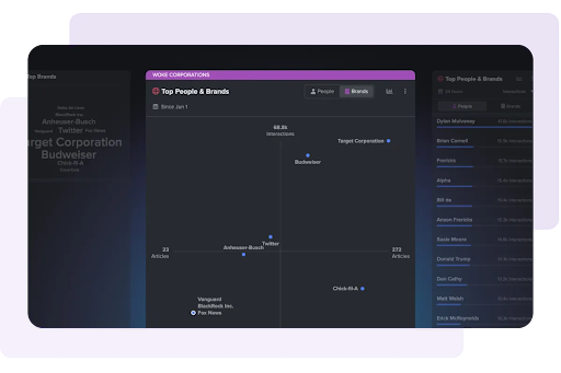 Firstly, our Top People and Brands visualization. This highlights the key subjects within a story – be it organizations or individuals. These are selected using a combination of media and public interest, giving users key insights into what is driving interest.