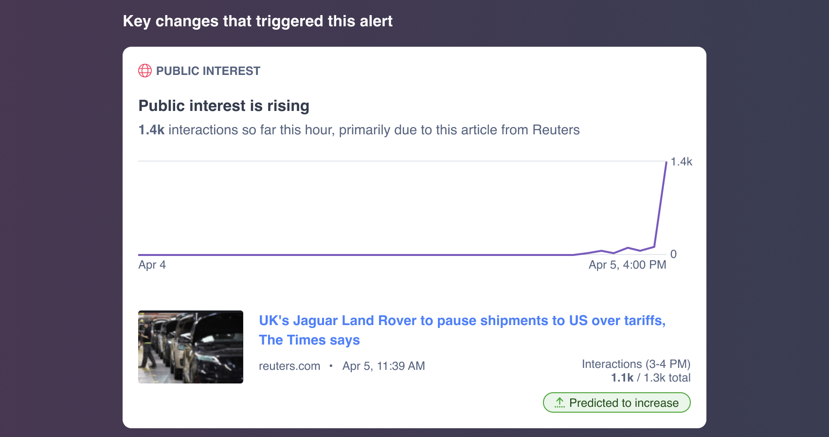 Track ongoing topics and receive alerts when there are meaningful shifts in volume, tone, or engagement.