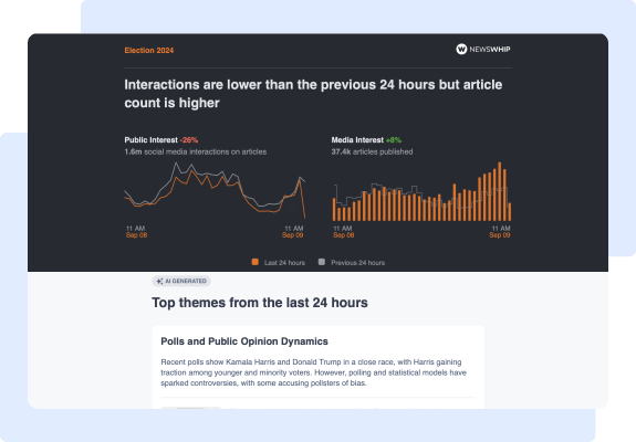 Let NewsWhip’s free US presidential race AI Digest do the heavy lifting for you. Every day you’ll receive an AI Digest delivered directly to your inbox, highlighting the most engaged articles from across the political spectrum, keeping you informed of every emerging narrative across the internet.