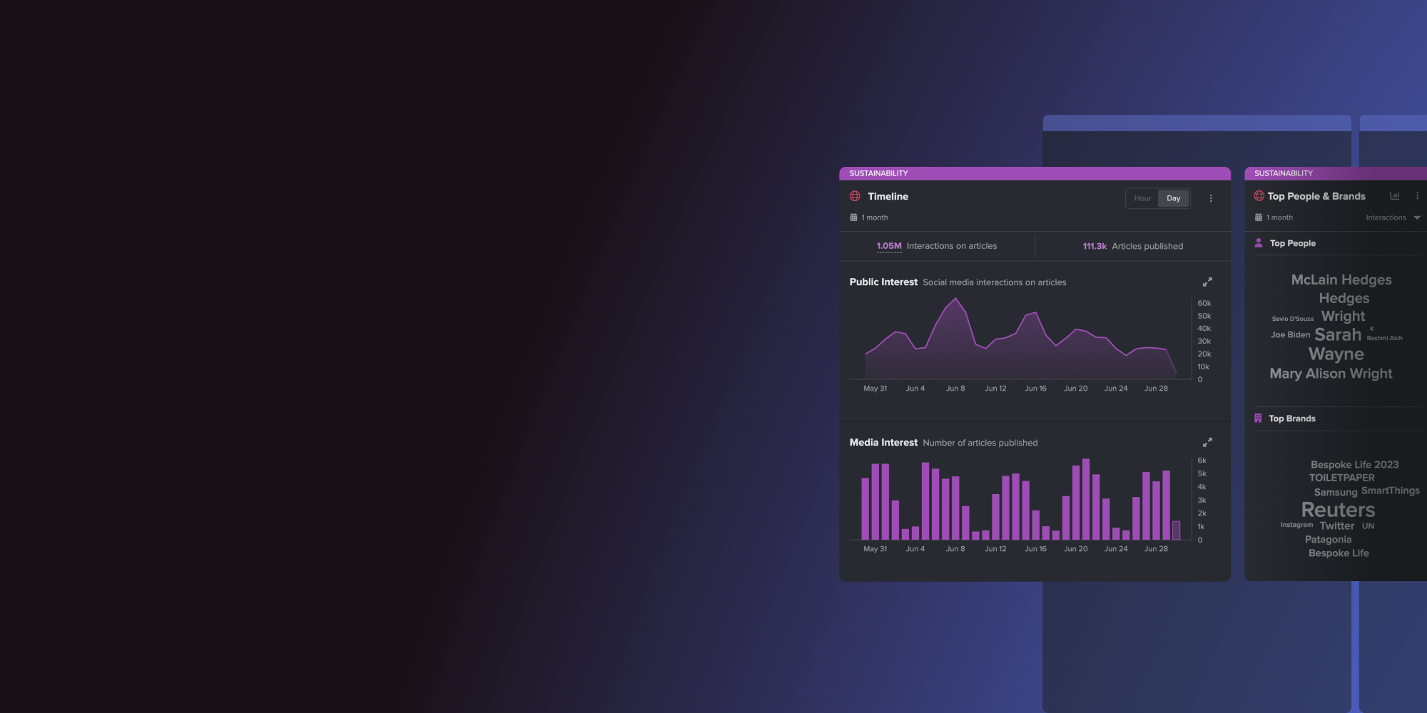 NewsWhip offers real-time web and social monitoring for your chosen topics, including ESG, DEI, competitor performance, and consumer insights. With our user-friendly platform, you can effortlessly access tangible real-world data, convert it into actionable insights, and generate reports with just a few clicks.